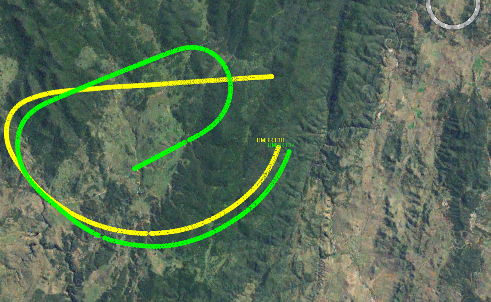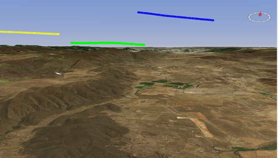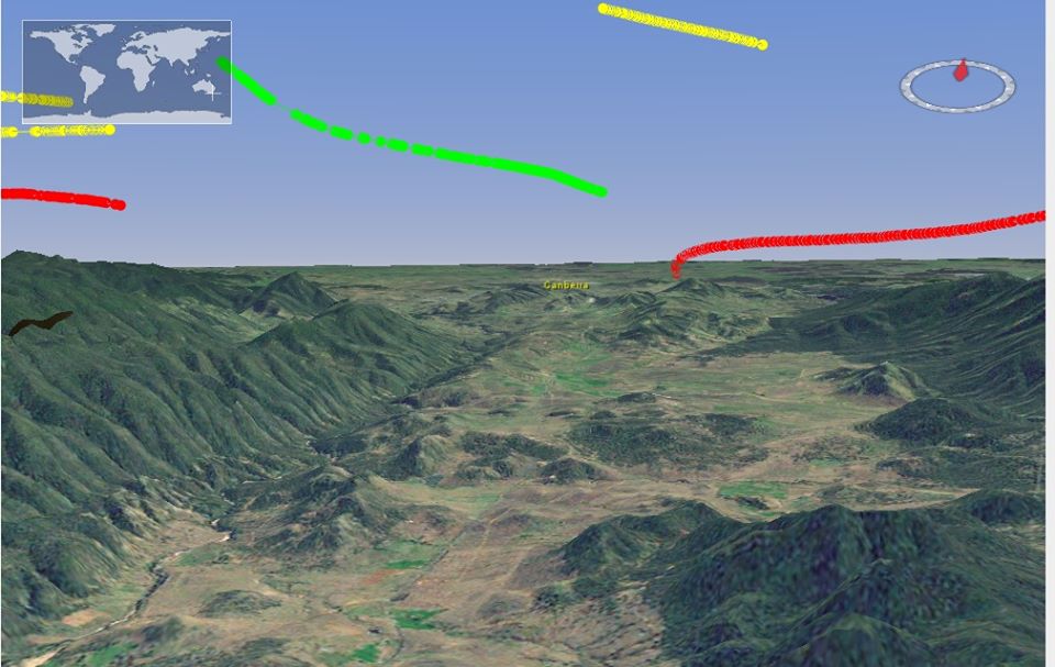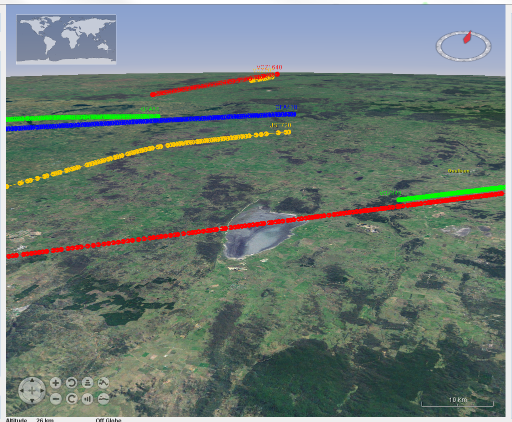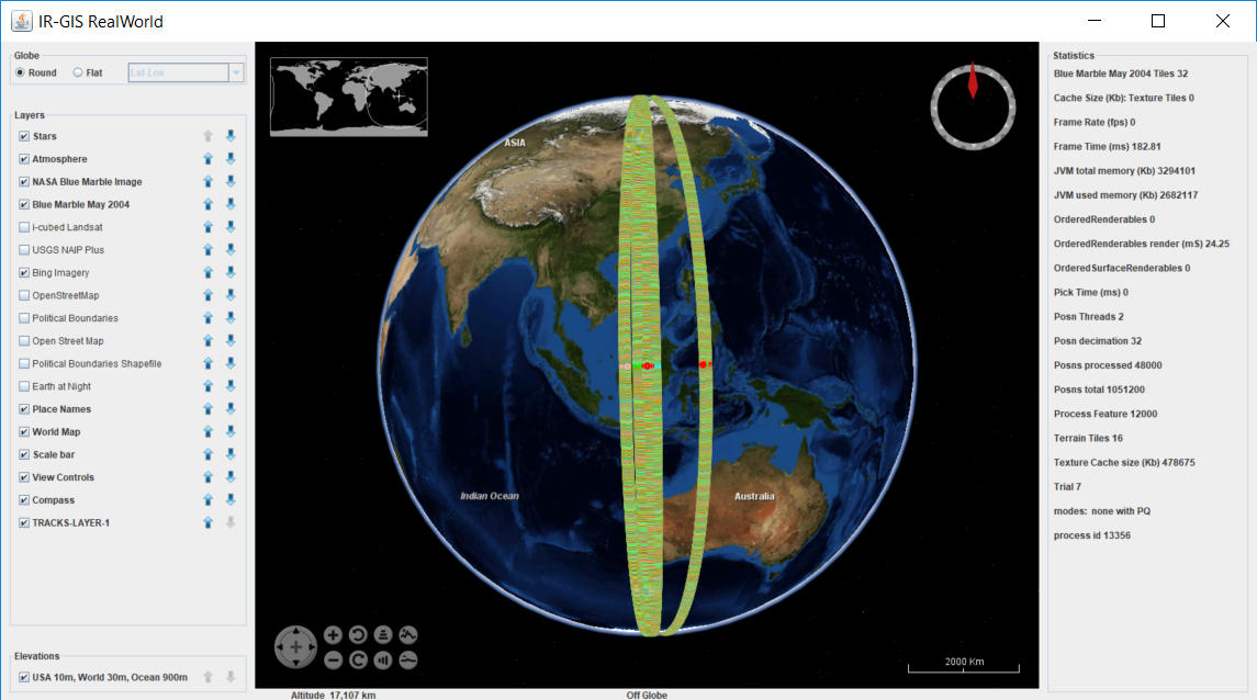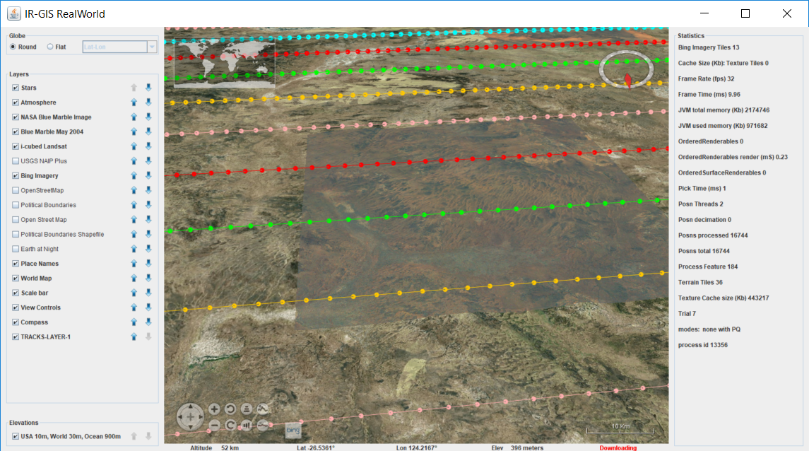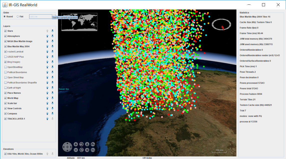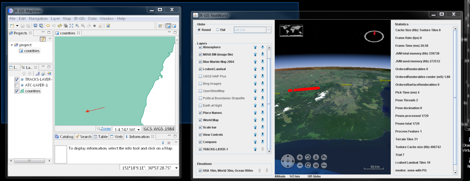 The following exhibited screen shots show some of the aspects of the product's rendering capabilities. Aircraft data is acquired from live-to-air public transmission by the aircraft themselves and received by Open Source piaware receivers. A conversion program and tracker piCap were written to convert between the receiver captured data and the IR-GIS ® application ir-xml format, and then injected into activemq JMS topics for distribution to the remaining IR-GIS ® applications.